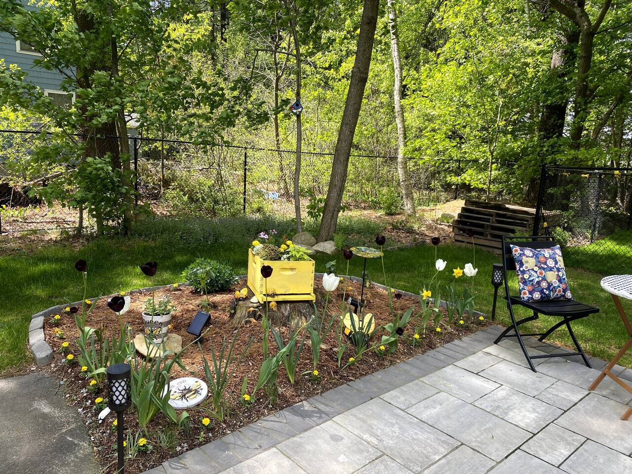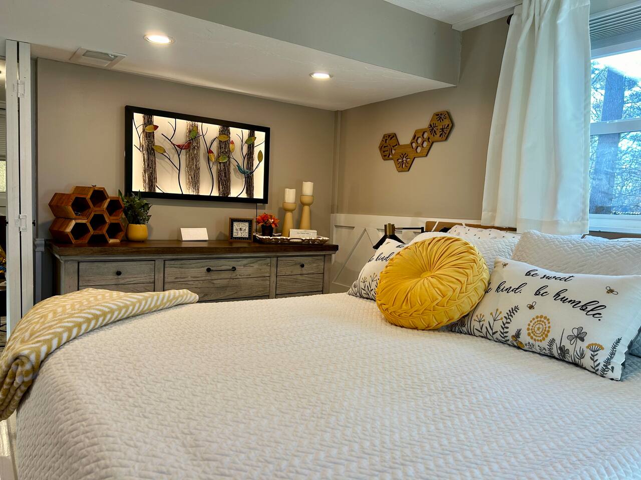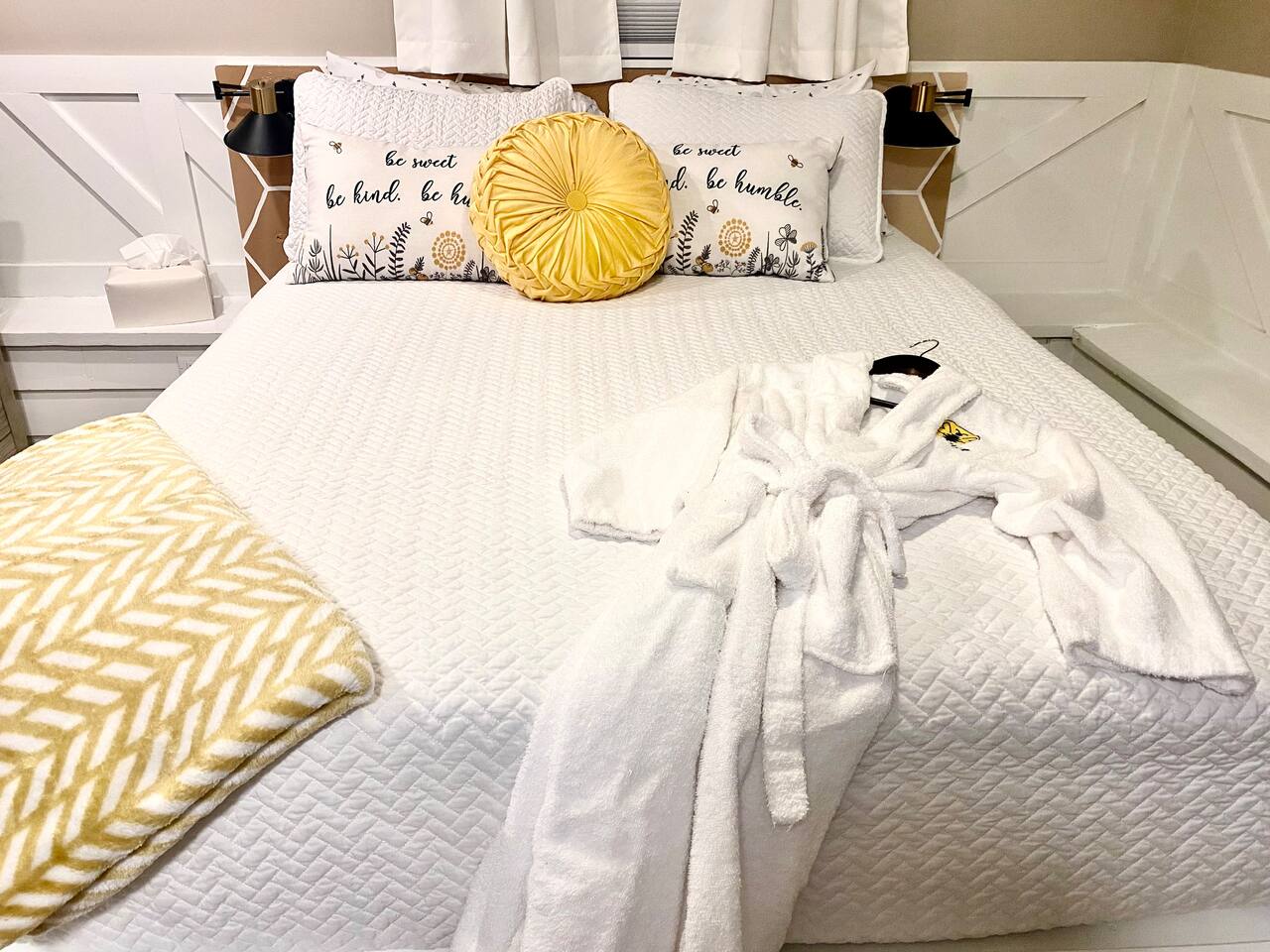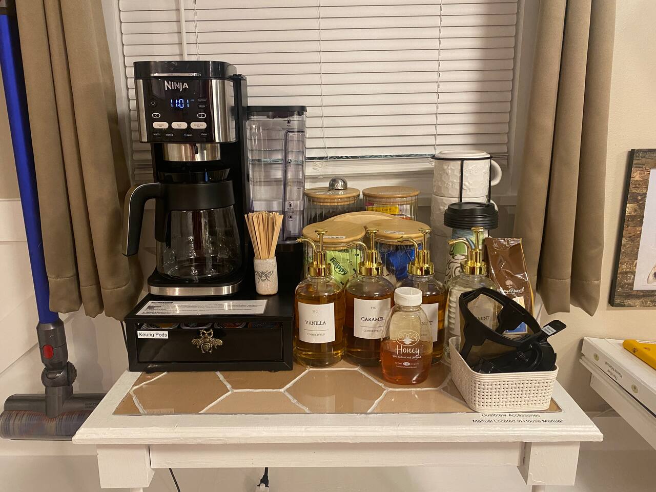 You’ll be all abuzz as you see the Hive’s honeybee theme emerge as you approach the apartment – with garden decked out with re-purposed beehive planters and bee garden decor. Step into the Hive’s foyer via convenient keyless entry and make your way to the open-concept living area, where you can relax on the comfy sectional sofa with chaise or play supplied board games. Enjoy the continuing bee theme as it unfolds throughout the space – from built-in hexagon furniture to bee decor, honey-colored accents, and adorable buzzing bees. Weary and hungry travelers not yet ready to make a meal can indulge in a snack from the kitchen table. Watch your favorite movies, shows, and sports on the 55" Samsung 4K TV via Apple TV with host-provided PLEX server (980+ movies on personal server) – plus cable channels. You can also access popular streaming services with your own log-ins. Content delivery is supported by super-fast Verizon Fios 1gbps (wireless speed in the Hive averages around 650 Mbps). Those with remote work needs will appreciate both the Wi-Fi and the provided workspace with a desk and executive office chair. Steps away, prep and cook your best culinary creations in the well-equipped kitchen featuring a refrigerator, 2-burner cooktop, microwave, toaster oven/air fryer, dishwasher, and a good selection of small appliances – waffle-maker, hand-mixer, blender, crock pot, rice cooker, and toaster. You’ll find plenty of counterspace – including the kitchen island – and all the cookware, bakeware, dishware, flatware, glassware, serving ware, and utensils you need to prepare and serve your favorite recipes. You can also count on fresh eggs from the Hive’s chickens! Dine at the kitchen table for 3 or at the kitchen peninsula with additional barstool seating for 2. Grab your morning hot beverage from the coffee bar with Keurig and electric kettle, along with coffee (ground and pods), tea, hot chocolate, honey, and other sweeteners, as well as flavored syrups. Sip your beverage on the patio in nice weather, enjoy the garden, and watch the antics of the nearby poultry. Plug into the provided EV charger as you head out for the day’s activities and after a full day of exploring all that the Boston metro area has to offer – or just hanging out enjoying the simple pleasures of the Hive, head for a restful night’s sleep in accommodations customized for the size of your group. For 1-2 guests, the bedroom offers a queen bed with sumptuous linens and flanked by sconce lights. Wind down to sleep watching the 42” Sony XBR2 1080P TV. Store your belongings in the dresser, closet, and the luggage rack in the closet. You’ll love the convenience of the well-lighted ensuite bathroom with shower stall and all bathroom essentials, including OPPEAL Delicen toiletries with Manuka honey and coconut oil. Parties of 4 guests will have use of the bedroom and sleeper sofa, which folds out into a full-size bed. Parties of 3 guests will have the bedroom and a twin rollaway bed so the sofa remains accessible for watching TV and relaxing. You’ll love the convenience of the washer and dryer. AMENITY HIGHLIGHTS: – Super-fast Verizon Fios 1gbps (wireless speed in the Hive averages around 650 Mbps) – EV charger – Built-in USB charging ports in the kitchen, bedroom, and living room – Views of geese and chickens from the fence or windows – Fresh chicken eggs in the fridge, snacks on the table – Coffee bar with coffee, tea, hot chocolate, flavored syrups, and more – Selection of small kitchen appliances – Host-provided PLEX server (980+ movies on our personal server) plus cable TV – Board games – Washer and dryer – Iron and ironing board – Extra pillows and blankets